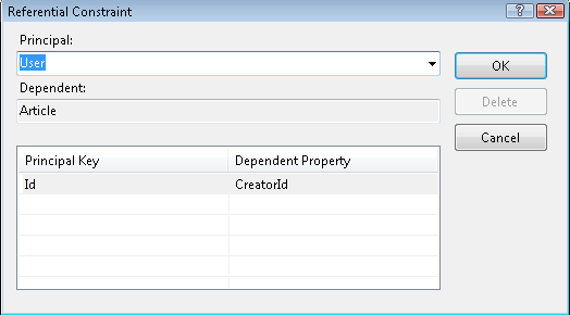 در اینجا مطابق شکل Principal و Dependent Property را انتخاب کنید. حالا توضیح این کارها: جداول User و Article به صورت 1-* متصل شدند که به این معنیه که هر کاربر می تونه چند مقاله ایجاد کرده باشه که این ایجاد از طریق ویژگی CreatorId در جدول Article معلوم میشه!