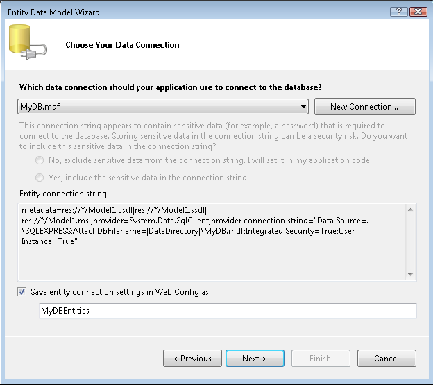 در این مرحله، اتصال به پایگاه داده انتخاب می شود؛ اگر از اتصال به فایل استفاده می کنید (همان طور که در آموزش بخش اول آمده) این صفحه خود به خود آماده می شود (اگر آماده نشده بود، اول یک بار فایل mdf خود را باز کنید و بعد به طی این مراحل بپردازید). توجه کنید که نام پایینی بعدا به عنوان اتصال استفاده خواهد شد و شما می توانید آن را به دلخواه تغییر دهد! حالا به مرحله ی بعد برید: