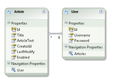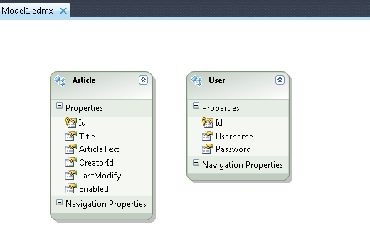 حالا باید این دو تا جدول رو به هم متصل کنیم (برای استفاده ی راحت تر)؛ برای این کار، از بخش Toolbox، گزینه ی Association را انتخاب کنید و بعد از روی جدول User به جدول Article بکشید (!drag) تا به شکل زیر در بیاد: